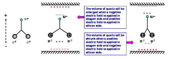 石英材料中的二氧化硅分子(SiO2) 在正常狀態下, 其電偶極是互相平衡的電中性. 在(圖中左)的二氧化硅是以二維空間的簡化圖形. 當我們在硅原子上方及氧原子下方分別給予正電場及負電場時, 空間系統為了維持電位平衡, 兩個氧原子會相互排斥, 在氧原子下方形成一個感應正電場區域, 同時在硅原子上方產生感應負電場區域. 相反的情況, 當我們在硅原子上方及氧原子下方分別給予負電場及正電場時, 兩個氧原子會相互靠近, 氧原子下方產生感應負電場,硅原子上方產生感應正電場. (圖中). 然而, 氧原子的水平位置變化時, 鄰近的另一個氧原子會相對的產生排斥或吸引的力量, 迫使氧原子回到原來的空間位置. 因此, 電場的力量與原子之間的力量會相互牽動, 電場的改變與水平方向的形變是形成交互作用狀態. 這個交互作用會形成一個在石英材料耗能最小的振動狀態, 祇要由電場持續給與能量, 石英材料就會與電場之間維持一個共振的頻率. 這個壓電效應下氧原子的振幅與電場強度及電場對二氧化硅的向量角度有相對應的關系.在實際的應用上, 電場是由鍍在石英芯片上的金屬電極產生, 電場與二氧化硅的向量角度則是由石英晶棒的切割角度來決定.