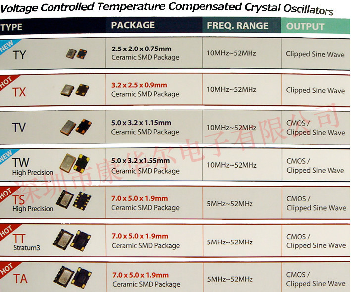 TA-7050溫補振蕩器,泰藝貼片晶體,進口晶體振蕩器,溫補晶振(TCXO)產品本身具有溫度補償作用,高低溫度穩定性:頻率精度高0.5 PPM?2.0 PPM,工作溫度范圍: - 30度?85度,電源電壓:1.8V?3.3V之間可供選擇,產品本身具有溫度電壓控制功能,世界上最薄的晶振封裝,頻率:26兆赫,33.6兆赫,38.4兆赫,40兆赫,因產品性能穩定,精度高等優勢,被廣泛應用到一些比較高端的數碼通訊產品領域,GPS全球定位系統,智能手機,WiMAX和蜂窩和無線通信等產品,符合RoHS/無鉛.