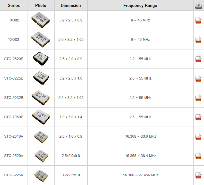 | 標稱頻率(MHz) | 8, 10, 12, 12.8, 13, 14.4, 16.368, 19.2, 19.8, 20, 24.5535, 26, 40 | ||