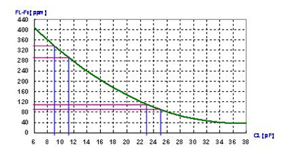 頻率的“牽引率”指的是負載電容CL1的頻率FL1到負載電容CL2的頻率FL2的頻率變化. 在(圖)中可以是FL1(CL=24pF)與FL2(CL=10pF)的頻率變化值. 在這個例子中的頻率牽引率是 220 ppm. 若我們將CL1與CL2的負載電容值趨近極小化(曲線作數(shù)學上的微分), 就會得到曲線的切線值. 這個切線值就是用某一個負載電容的敏感度( trim sensitivity ).