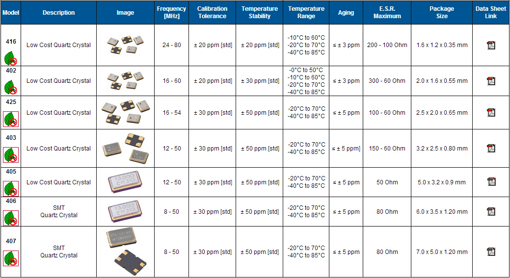 | Manufacturer Part Number原廠編碼 | Manufacturer廠家 | Series型號 | Frequency | Size / Dimension 尺寸 |