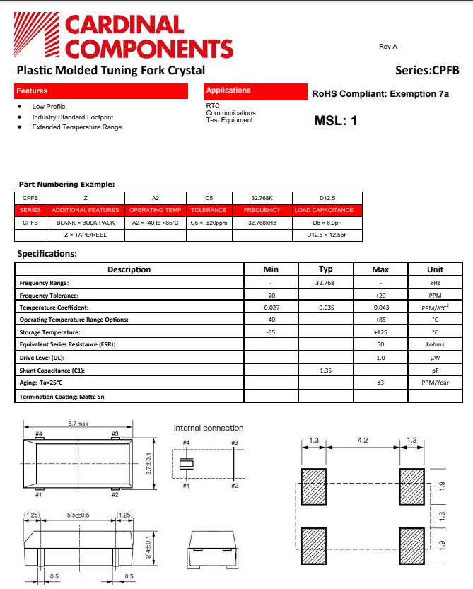 | CPFBZ-A2C5-32.768D6 | Cardinal晶振 | CPFB | 32.768kHz | 6pf | 20ppm | 50 kOhm | -40°C ~ 85°C |