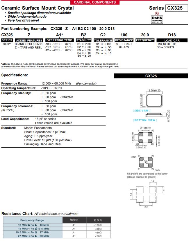 Cardinal晶振,CX325Z-A5B2C5-50-16.0D18,6G常用晶振參數表