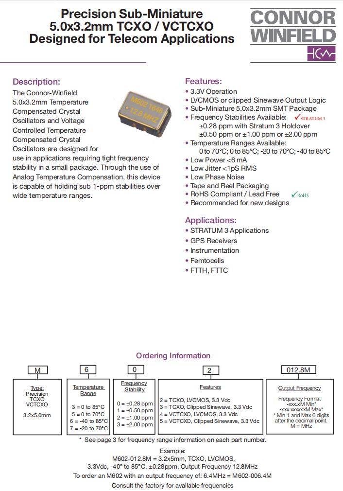 M602-012.8M,低相噪石英振蕩器,6G基站晶振,ConnorWinfield晶振,美國進口晶振,M60有源晶振,M602-012.8M晶振,5032mm晶振,低相噪晶振,石英晶體振蕩器,頻率12.8MHz,電壓3.3V,工作溫度-40~85°C,頻率穩(wěn)定性0.28ppm,低抖動晶振,低功耗晶振,6G基站晶振,GPS接收器晶振,儀器儀表應用晶振,Femtocells晶振,FTTH晶振.