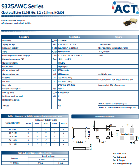 ACT晶振,9325AWC晶振,石英晶體振蕩器.3225mm體積的晶振,可以說是目前小型數(shù)碼產(chǎn)品的福音,目前超小型的智能手機里面所應(yīng)用的就是小型的石英晶振,該產(chǎn)品最適用于無線通訊系統(tǒng),無線局域網(wǎng),已實現(xiàn)低相位噪聲,低電壓,低消費電流和高穩(wěn)定度,超小型,質(zhì)量輕等產(chǎn)品特點,產(chǎn)品本身編帶包裝方式,可對應(yīng)自動高速貼片機應(yīng)用,以及高溫回流焊接(產(chǎn)品無鉛對應(yīng)),為無鉛產(chǎn)品.