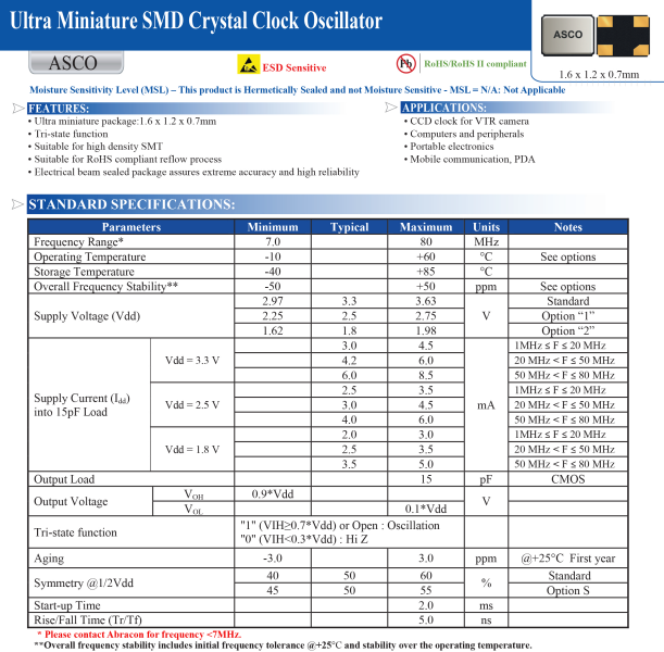 ABRACON晶振,ASCO-12.000MHZ-EK-T3晶振,ASCO晶振,有源晶體振蕩器.有源晶振,是只晶體本身起振需要外部電壓供應,起振后可直接驅動CMOS 集成電路,產品本身已實現與薄型IC(TSSOP封裝,TVSOP封裝)同樣的1mm厚度,斷開時的消費電流是15 µA以下,編帶包裝方式可對應自動搭載及IR回流焊接(無鉛對應)產品有幾種電壓供選1.8V,2.5V,3V3.3V,5V,以應對不同IC產品需要.