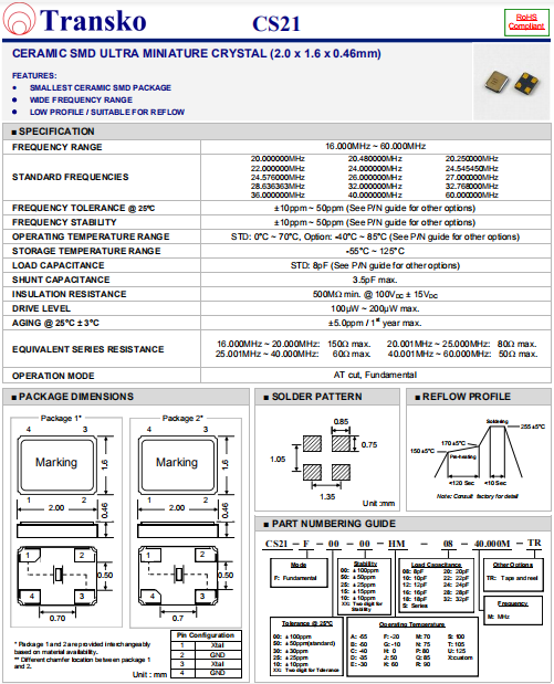Transko晶振,CS21晶振,高性能石英晶體.貼片石英晶體,體積小,焊接可采用自動貼片系統(tǒng),產(chǎn)品本身小型,表面貼片晶振,特別適用于有小型化要求的電子數(shù)碼產(chǎn)品市場領域,因產(chǎn)品小型,薄型優(yōu)勢,耐環(huán)境特性,包括耐高溫,耐沖擊性等,在移動通信領域得到了廣泛的應用,晶振產(chǎn)品本身可發(fā)揮優(yōu)良的電氣特性,滿足無鉛焊接的高溫回流溫度曲線要求.