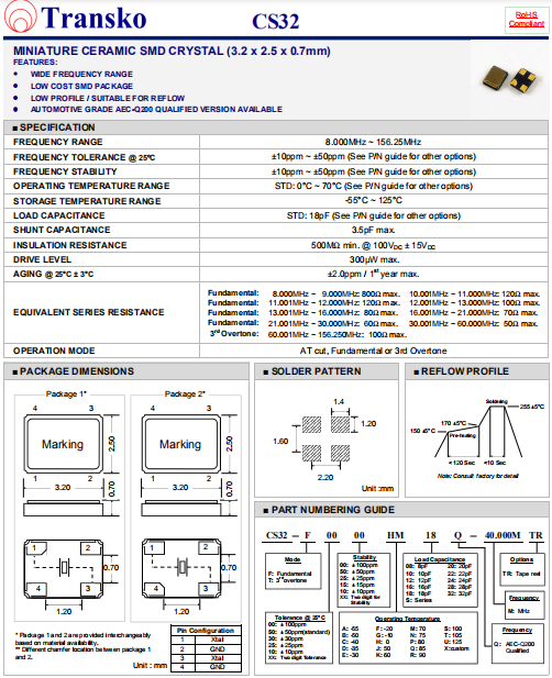 Transko晶振,CS32晶振,貼片無源晶體.貼片晶振本身體積小,超薄型石英晶體諧振器,特別適用于有目前高速發(fā)展的高端電子數(shù)碼產(chǎn)品,因為晶振本身小型化需求的市場領域,小型,薄型是對應陶瓷諧振器(偏差大)和普通的石英晶體諧振器(偏差小)的中間領域的一種性價比較出色的產(chǎn)品.產(chǎn)品廣泛用于筆記本電腦,無線電話,衛(wèi)星導航HDD, SSD, USB, Blu-ray等用途,符合無鉛焊接的高溫回流焊曲線特性.