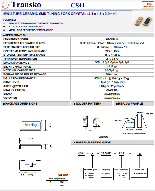 Transko晶振,CS41晶振,音叉晶體.貼片壓電石英晶體,體積小,焊接可采用自動貼片系統,產品本身小型,表面貼片晶振,特別適用于有小型化要求的電子數碼產品市場領域,因產品小型,薄型優勢,耐環境特性,包括耐高溫,耐沖擊性等,在移動通信領域得到了廣泛的應用,晶振產品本身可發揮優良的電氣特性,滿足無鉛焊接的高溫回流溫度曲線要求.
