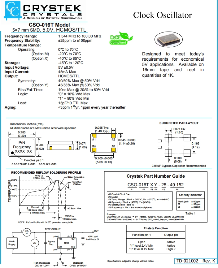 CRYSTEK晶振,CSO-016T晶振,高質量有源振蕩器.貼片式石英晶體振蕩器,低電壓啟動功率,并且有多種電壓供選擇,比如有1.8V,2.5V,3.3V,3.8V,5V等,產品被廣泛應用于,平板筆記本,GPS系統,光纖通道,千兆以太網,串行ATA,串行連接SCSI,PCI-Express的SDH/SONET發射基站等領域.符合RoHS/無鉛.