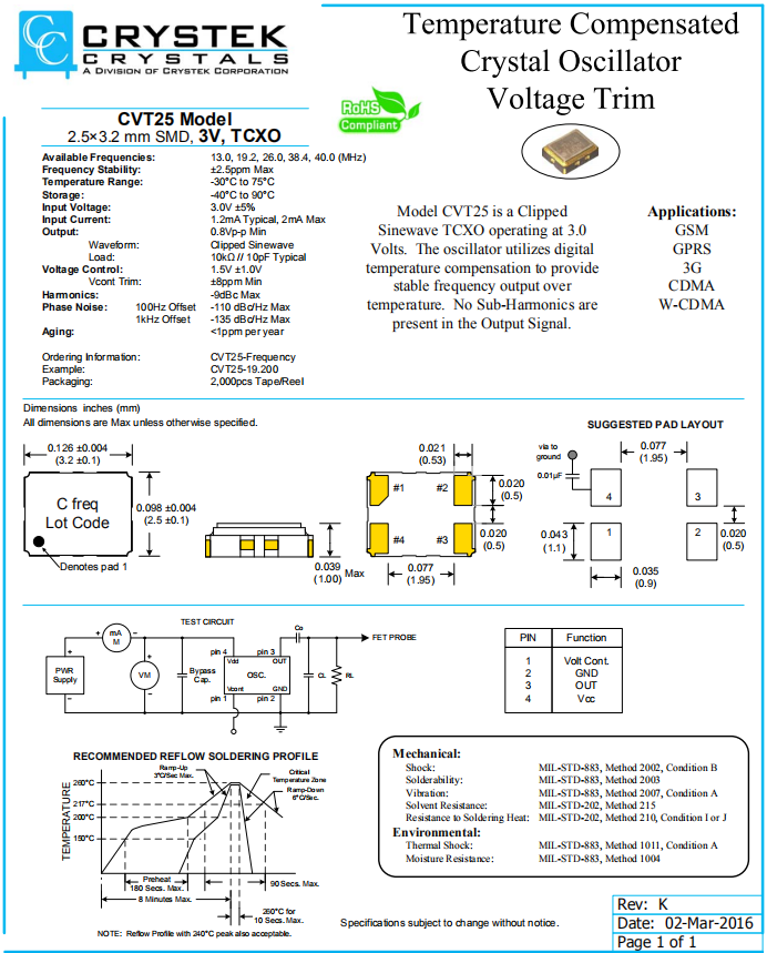 CRYSTEK晶振,CVT25晶振,溫補(bǔ)晶體振蕩器.小型SMD有源晶振,從最初超大體積到現(xiàn)在的7050mm,6035mm,5032mm,3225mm,2520mm體積,有著翻天覆地的改變,體積的變小也試產(chǎn)品帶來(lái)了更高的穩(wěn)定性能,接縫密封石英晶體振蕩器,精度高,覆蓋頻率范圍寬的特點(diǎn),SMD高速自動(dòng)安裝和高溫回流焊設(shè)計(jì),Optionable待機(jī)輸出三態(tài)輸出功能,電源電壓范圍:1.8V?5V,高穩(wěn)定性,低抖動(dòng),低功耗,主要應(yīng)用領(lǐng)域:無(wú)線通訊,高端智能手機(jī),平板筆記本W(wǎng)LAN,藍(lán)牙,數(shù)碼相機(jī),DSL和其他IT產(chǎn)品的晶振應(yīng)用,三態(tài)功能,PC和LCDM等高端數(shù)碼領(lǐng)域,符合RoHS/無(wú)鉛.