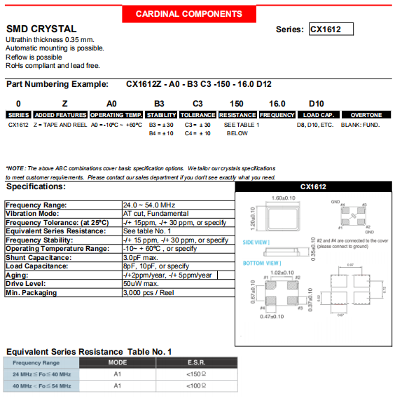 Cardinal晶振,CX1612晶振,進口貼片晶振.貼片晶振本身體積小,超薄型石英晶體諧振器,特別適用于有目前高速發(fā)展的高端電子數碼產品,因為晶振本身小型化需求的市場領域,小型,薄型是對應陶瓷諧振器(偏差大)和普通的壓電石英晶體諧振器(偏差?。┑闹虚g領域的一種性價比較出色的產品.產品廣泛用于筆記本電腦,無線電話,衛(wèi)星導航HDD, SSD, USB, Blu-ray等用途,符合無鉛焊接的高溫回流焊曲線特性.