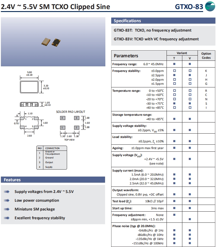 Goliedge晶振,GTXO-83晶振,溫補晶振.5032mm體積的石英晶體振蕩器有源晶振,改產(chǎn)品可驅(qū)動2.5V的溫補晶振,壓控晶振,VC-TCXO晶體振蕩器產(chǎn)品,電源電壓的低電耗型,編帶包裝方式,可對應自動高速貼片機自動焊接,及IR回流焊接(無鉛對應),為無鉛產(chǎn)品,超小型,質(zhì)地輕.產(chǎn)品被廣泛應用到集成電路,程控交換系統(tǒng),無線發(fā)射基站.