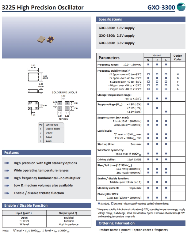 Golledge晶振,GXO-3300晶振,CMOS振蕩器.3225mm體積貼片晶振適用于消費電子領域的表面貼片型石英晶振,本產品已被確定的高信賴性適合用于汽車電子部件,晶體在嚴酷的環(huán)境條件下也能發(fā)揮穩(wěn)定的起振特性,晶振本身具有耐熱,耐振,耐沖擊等優(yōu)良的耐環(huán)境特性,滿足無鉛焊接的高溫回流溫度曲線要求,符合AEC-Q200認證.