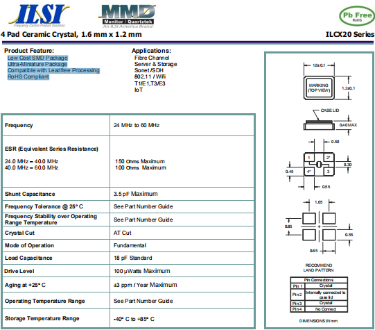 ILSI晶振,ILCX20晶振,高性能石英晶體.小型表面貼片晶振型,是標準的石英晶體諧振器,適用于寬溫范圍的電子數碼產品,家電電器及MP3,MP4,播放器,單片機等領域.可對應24.000MHz以上的頻率,在電子數碼產品,以及家電相關電器領域里面發揮優良的電氣特性,滿足無鉛焊接的回流溫度曲線要求.