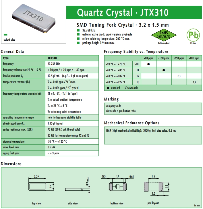 JAUCH晶振,JTX310晶振,壓電石英晶體.貼片表晶32.768K系列具有超小型,薄型,質地輕的表面貼片音叉型石英晶體諧振器,晶振產品本身具備優(yōu)良的耐熱性,耐環(huán)境特性,在辦公自動化,家電領域,移動通信領域可發(fā)揮優(yōu)良的電氣特性,符合無鉛標準,滿足無鉛焊接的回流溫度曲線要求,金屬外殼的石英晶振使得產品在封裝時能發(fā)揮比陶瓷晶振外殼更好的耐沖擊性能.