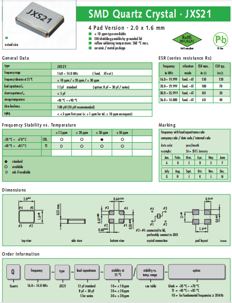 JAUCH晶振,JXS21晶振,無源石英晶體.普通貼片石英晶振外觀使用金屬材料封裝的,具有高穩定性,高可靠性的石英晶體諧振器,晶振外觀本身使用金屬封裝,充分的密封性能,可確保其高可靠性,采用編帶包裝,外包裝采用朔膠盤,可在自動貼片機上對應自動貼裝等優勢.