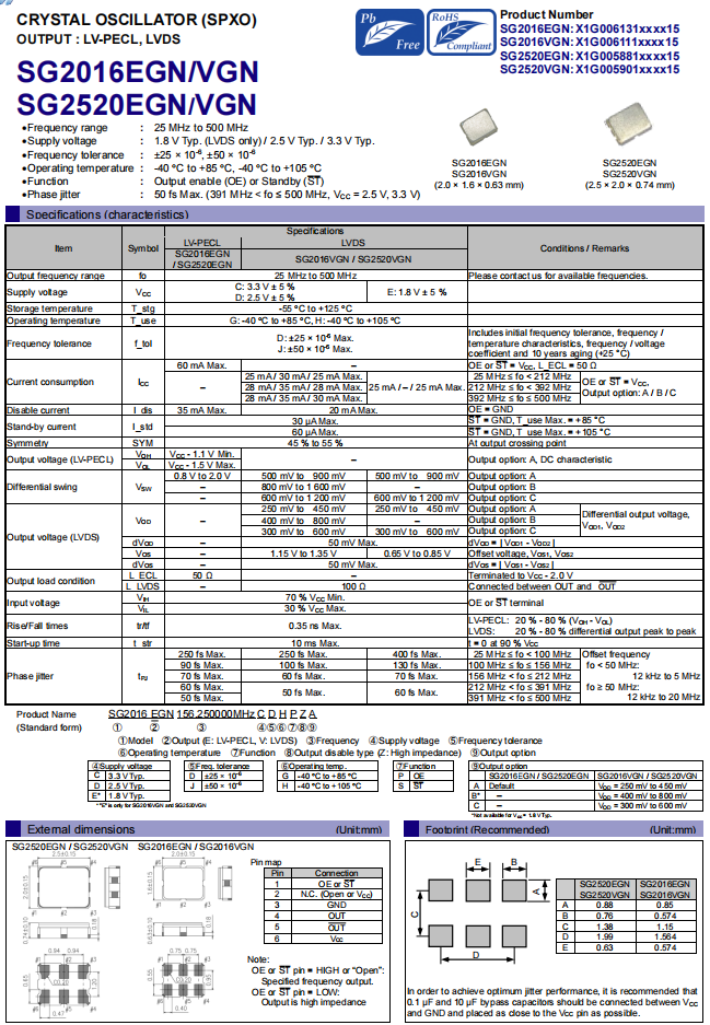 | X1G0059410005 | SG2520VHN | 156.250000 MHz | 2.50 x 2.00 x 0.84 mm | LVDS | 3.135 to 3.465 V | -40 to 105 °C |