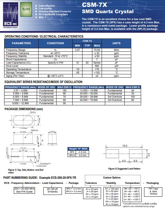 | ECS-200-S-5PX-TR | CSM-7X | 20MHz | ±30ppm | Series | -10°C ~ 70°C | HC49/US |