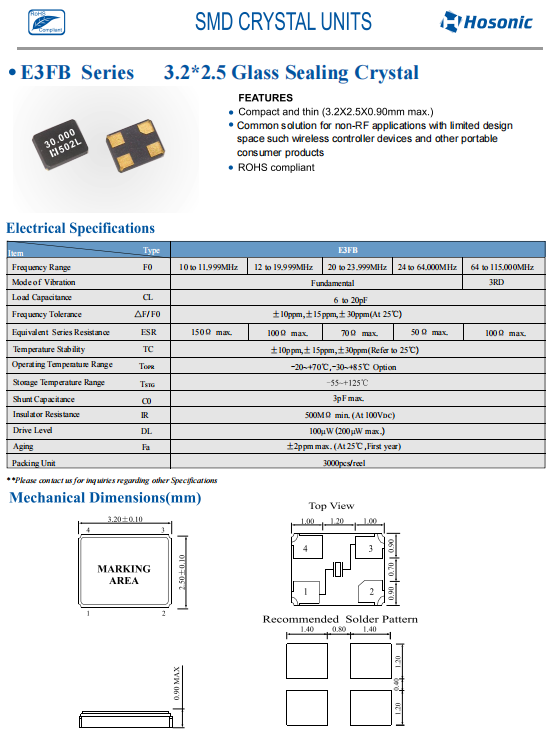 | E3FB20.0000F18E33 | Hosonic晶振 | E3FB | 20MHz | 18pF | ±30ppm | ±30ppm |