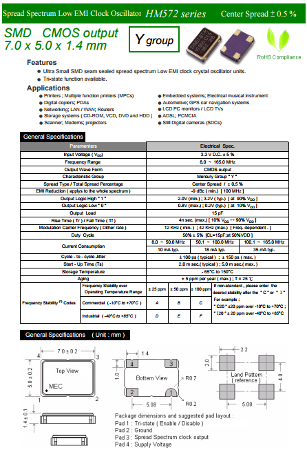 MERCURY晶振,瑪居禮振蕩器,HM572Y石英振蕩子.小型SMD有源晶振,從最初超大體積到現(xiàn)在的7050mm,有著翻天覆地的改變,體積的變小也試產(chǎn)品帶來了更高的穩(wěn)定性能,接縫密封石英晶體振蕩器,精度高,覆蓋頻率范圍寬的特點(diǎn),SMD高速自動(dòng)安裝和高溫回流焊設(shè)計(jì),Optionable待機(jī)輸出三態(tài)輸出功能,電源電壓范圍:1.8V?5 V,高穩(wěn)定性,低抖動(dòng),低功耗,主要應(yīng)用領(lǐng)域:無線通訊,高端智能手機(jī),平板筆記本W(wǎng)LAN,藍(lán)牙,數(shù)碼相機(jī),DSL和其他IT產(chǎn)品的晶振應(yīng)用,三態(tài)功能,PC和LCDM等高端數(shù)碼領(lǐng)域,符合RoHS/無鉛.