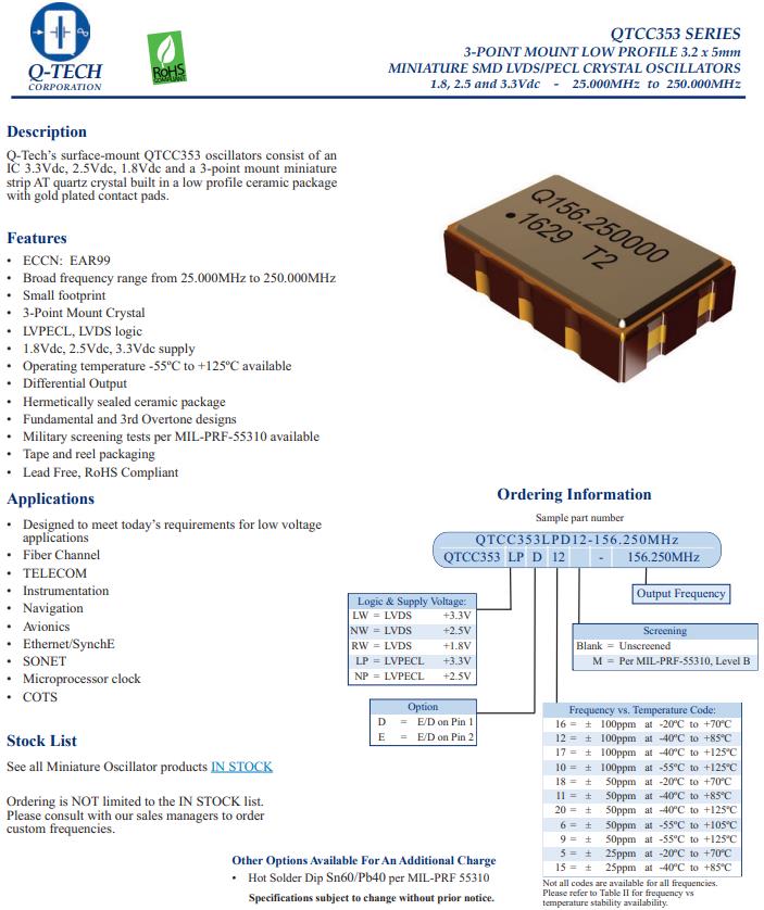 QTCC353LPD12-156.250MHz,5032mm差分貼片晶振,6G基站晶振,美國Q-Tech晶振,QTCC353有源晶振,QTCC353LPD12-156.250MHz晶振,LVPECL輸出晶振,差分貼片晶振,5032mm晶振,頻率156.25MHz,電壓3.3V,工作溫度-40~85°C,頻率穩定性100ppm,6G基站晶振,光纖通道晶振,儀器設備晶振,航空電子設備晶振,以太網晶振,COTS應用晶振.