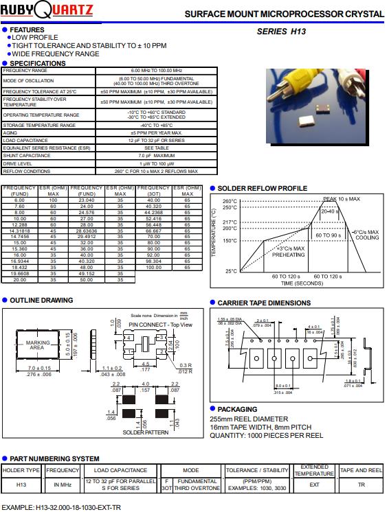 Rubyquartz晶體,H13無源諧振器,H13-12.000-18-1030-EXT-TR貼片晶振,貼片晶振本身體積小,超薄型石英晶體振蕩器,特別適用于有目前高速發展的高端電子數碼產品,因為晶振本身小型化需求的市場領域,小型,薄型是對應陶瓷振蕩器(偏差大)和普通的石英晶體振蕩器(偏差小)的中間領域的一種性價比較出色的產品.產品廣泛用于筆記本電腦,無線電話,衛星導航SSD,USB,Blu-ray等用途,符合無鉛焊接的高溫回流焊曲線特性.