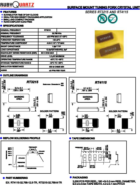 Rubyquartz歐美晶振,RT3215石英晶體,RT3215-32.768K-9-TR諧振器,32.768K時鐘晶體具有小型,薄型,輕型的貼片晶振表面音叉型晶體振蕩器,產(chǎn)品具有優(yōu)良的耐熱性,耐環(huán)境特性,可發(fā)揮晶振優(yōu)良的電氣特性,符合RoHS規(guī)定,滿足無鉛焊接的高溫回流溫度曲線要求,金屬外殼的封裝使得產(chǎn)品在封裝時能發(fā)揮比陶瓷振蕩器外殼更好的耐沖擊性.