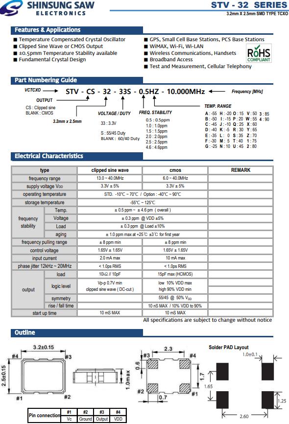 韓國新松晶振,STV-32貼片溫補晶振,STV-CS-32-33S-0.5HZ-10.000MHz有源振蕩子,小型SMD有源晶振,從最初超大體積到現在的7050mm,6035mm,5032mm,3225mm,2520mm體積,有著翻天覆地的改變,體積的變小也使產品帶來了更高的穩定性能,接縫密封石英晶體振蕩器,精度高,覆蓋頻率范圍寬的特點,SMD高速自動安裝和高溫回流焊設計,Optionable待機輸出三態輸出功能,電源電壓范圍:1.8V~5V,高穩定性,低抖動,低功耗,主要應用領域:無線通訊,高端智能手機,平板筆記本WLAN,藍牙,數碼相機,DSL和其他IT產品的晶振應用,三態功能,PC和LCDM等高端數碼領域,符合RoHS/無鉛.