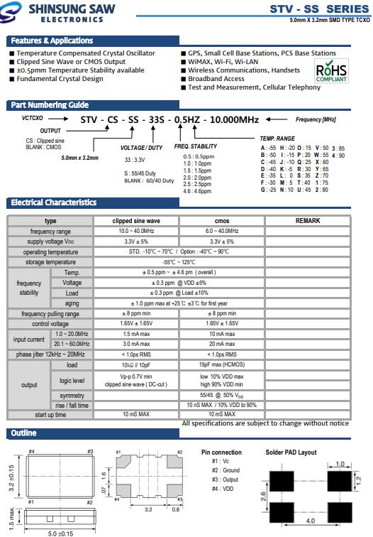 SHINSUNG晶振,STV-SS手持設備晶振,STV-CS-SS-33S-0.5HZ-16.000MHz晶振,5032mm體積的石英晶體振蕩器,有源晶振,該產品可驅動2.5V的溫補晶振,壓控晶振,VC-TCXO晶體振蕩器產品,電源電壓的低電耗型,編帶包裝方式,可對應自動高速貼片機自動焊接,及IR回流焊接(無鉛對應),為無鉛產品,超小型,質地輕.產品被廣泛應用到集成電路,程控交換系統,無線發射基站.