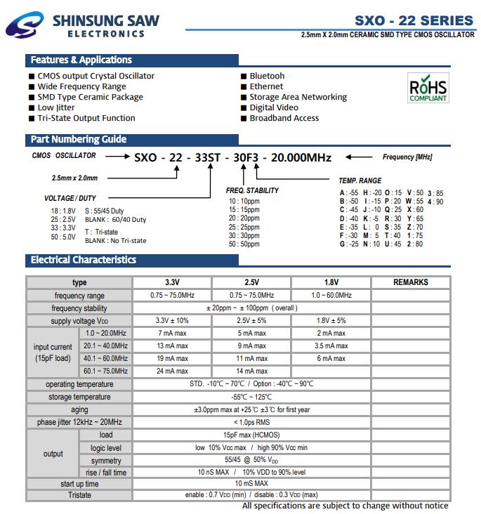 韓國新松晶振,SXO-22晶體振蕩器,SXO-22-15ST-30F3-20.000MHz晶振,有源晶振,是指晶體本身起振需要外部電壓供應(yīng),起振后可直接驅(qū)動CMOS集成電路,產(chǎn)品本身已實現(xiàn)與薄型IC(TSSOP封裝,TVSOP封裝)同樣的1mm厚度,斷開時的消費電流是15µA以下,編帶包裝方式可對應(yīng)自動搭載及IR回流焊接(無鉛對應(yīng))產(chǎn)品有幾種電壓供選1.8V,2.5V,3V3.3V,5V,以應(yīng)對不同IC產(chǎn)品需要.