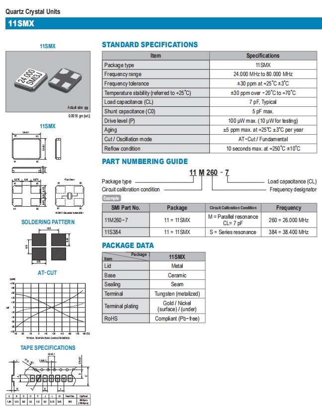 11M250-12晶振,日本SMI高精度晶體,移動通訊晶振,日本SMI晶振公司,高品質晶振,低損耗晶振,1612晶振,超小型晶振,日本進口晶振,四腳晶振,石英晶振,貼片晶振,無源晶振,6G晶振,6G基站控制器晶振,11SMX晶振.貼片石英晶體,體積小,焊接可采用自動貼片系統,產品本身小型,表面,特別適用于有小型化要求的市場領域,因產品小型,薄型優勢,耐環境特性,包括耐高溫,耐沖擊性等,在移動通信領域得到了廣泛的應用,晶振產品本身可發揮優良的電氣特性,滿足無鉛焊接的高溫回流溫度曲線要求.
