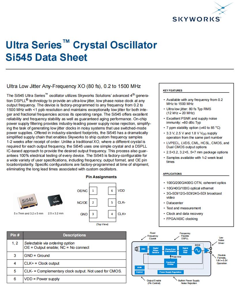 Skyworks有源晶振,545BAA78M1250BBGR晶振,6G以太網(wǎng)晶振 ,美國(guó)Skyworks晶振公司,Si545有源晶振,545BAA78M1250BBGR晶振,歐美進(jìn)口晶振,貼片石英晶體振蕩器,5032mm晶振,頻率200MHz,電壓3.3V,工作溫度-40~85°C,頻率穩(wěn)定性50ppm,LVDS差分晶振,超低抖動(dòng)晶振,6G以太網(wǎng)晶振,數(shù)據(jù)中心應(yīng)用晶振,測(cè)試與測(cè)量設(shè)備晶振,時(shí)鐘和數(shù)據(jù)恢復(fù)應(yīng)用晶振.Si545系列振蕩器采用Skyworks Solutions先進(jìn)的第4代 DSPLL®技術(shù),在任何輸出頻率下提供超低抖動(dòng),低相位噪聲時(shí)鐘。該設(shè)備在工廠(chǎng)編程為0.2至1500 MHz的任何頻率,分辨率<1 ppb,并在其工作范圍內(nèi)保持整數(shù)和分?jǐn)?shù)頻率的極低抖動(dòng)。Si545具有出色的可靠性和頻率穩(wěn)定性以及保證的老化性能。片上電源濾波提供業(yè)界領(lǐng)先的電源噪聲抑制,簡(jiǎn)化了在使用開(kāi)關(guān)模式電源的噪聲系統(tǒng)中產(chǎn)生低抖動(dòng)時(shí)鐘的任務(wù)。Si545提供行業(yè)標(biāo)準(zhǔn)的足跡,大大簡(jiǎn)化了供應(yīng)鏈,使Skyworks能夠在收到訂單后1-2周內(nèi)發(fā)送定制頻率樣品。不同于傳統(tǒng)的XO,每個(gè)輸出頻率都需要不同的晶體,Si545使用一個(gè)簡(jiǎn)單的晶體和基于DSPLL ic的方法來(lái)提供所需的輸出頻率。這個(gè)過(guò)程也保證保證每個(gè)設(shè)備100%的電氣測(cè)試。Si545可在工廠(chǎng)配置,適用于各種用戶(hù)規(guī)格,包括頻率,輸出格式和OE引腳位置/極性。