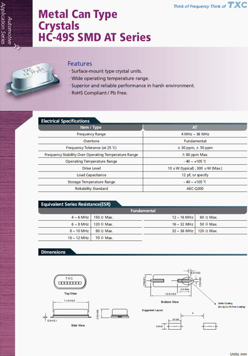 TXC晶振,AT-16.666MBGJ-T晶振,汽車空調控制面板晶振,臺灣TXC晶振公司,晶技晶振,臺灣晶振,進口晶振,四腳晶振,AT-16.666MBGJ-T晶振,無源晶振,網絡設備晶振,汽車晶振,高品質晶振,汽車氛圍燈晶振,大燈控制器晶振,小尺寸晶振,耐高溫晶振,金屬罐型,晶體, AT系列HC-49S SMD,特征,表面貼裝型晶體單元。工作溫度范圍寬。·惡劣環境下性能優越可靠。符合RoHS標準/無鉛。