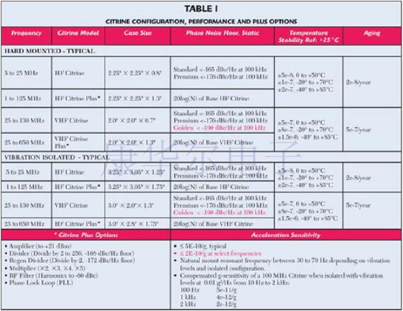 新型Citrine系列晶體振蕩器專為在要求靜態(tài)和動(dòng)態(tài)條件下具有低相位噪聲性能的最苛刻應(yīng)用提供廣泛的貼片晶振產(chǎn)品.黃水晶振蕩器可以配置為1~650MHz之間的任何固定頻率.黃水晶系列有八種配置.低頻HF振蕩器和VHF振蕩器均可使用,也可以不使用隔振系統(tǒng).而且,“PLUS”系列還提供HF和VHFCitrines,當(dāng)應(yīng)用需要額外的功能時(shí),可添加乘法器,分頻器,放大器,濾波器和雙輸出. Citrine系列具有多種包裝配置,可以根據(jù)頻率,所需的選件,性能規(guī)格和其他應(yīng)用注意事項(xiàng)進(jìn)行選擇.有關(guān)標(biāo)準(zhǔn)Citrine配置和性能選項(xiàng),請參見表1. 黃水晶靜態(tài)相位噪聲性能