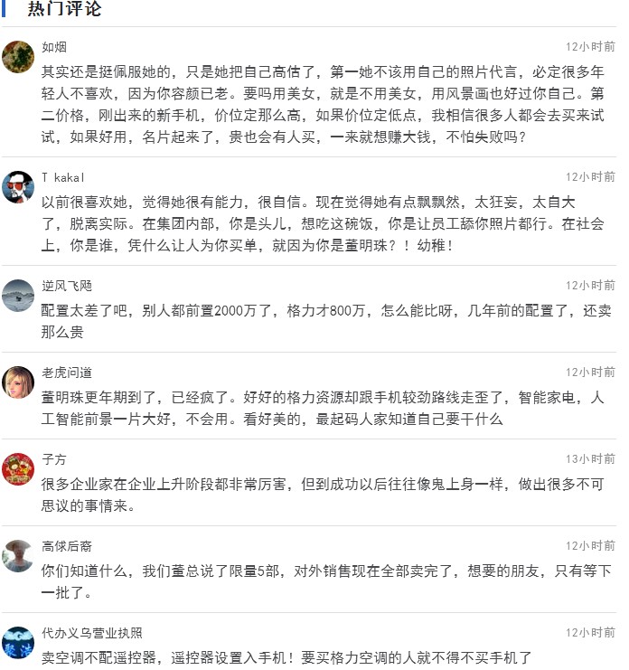 根據(jù)格力官方銷售平臺顯示,目前只賣出5臺,這款手機據(jù)說是董明珠親自代言做廣告,手機開機畫面即為董明珠本人,希望能讓國人愛上中國制造。這銷量可真是震驚了整個手機界。之前董明珠大膽放言:“華為賣老大,我就賣老二嘛。”但是,理想很美好,現(xiàn)實卻很殘酷。董明珠的豪言與現(xiàn)在目前銷量上很不符合,由此,各種聲音此起彼伏“董大媽對于這你真不怕被打臉么?”借助網(wǎng)友的話,"那個開機畫面,實在是看著心累,董大媽太搶鏡。""建議董大媽不要再折騰做手機了,好好做格力空調(diào)吧,把空調(diào)質(zhì)量再進一步的完美"等等之類的話,可讓網(wǎng)友們操碎了心,我們來看看網(wǎng)友的一些評論,此評論來源由騰訊網(wǎng):