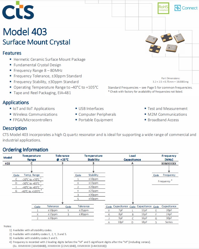 | 403I35D12M00000 | CTS Crystal | 403 | MHz Crystal | 12MHz | 4-SMD, No Lead |