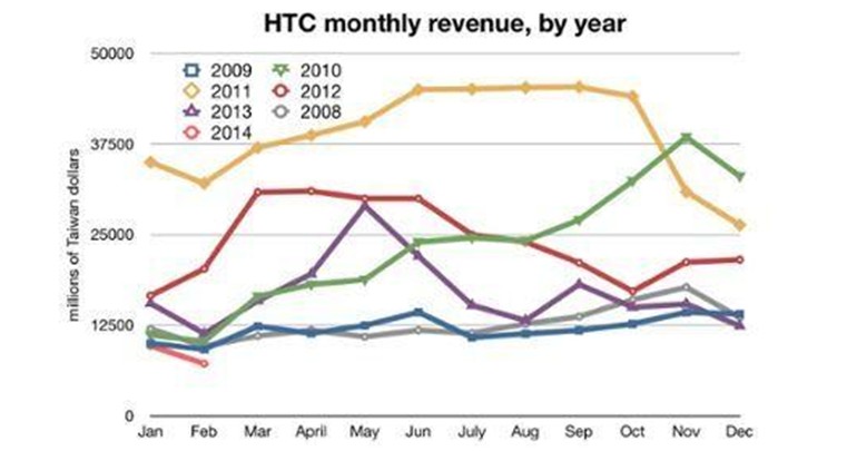 去年,HTC的營收是781.6億新臺幣,創2011年以來最低,并且不到2011年的17%。今年,按照前幾個月的趨勢,HTC有可能再創新低。