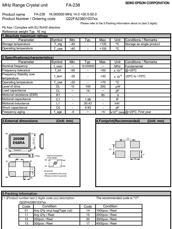 | Q22FA2380103700 | 3.2 x 2.5 x 0.7mm | FA-238 | 00.000000 MHz | 14 pF | +/-50 ppm | +/-30 ppm | -20 to +70 °C |