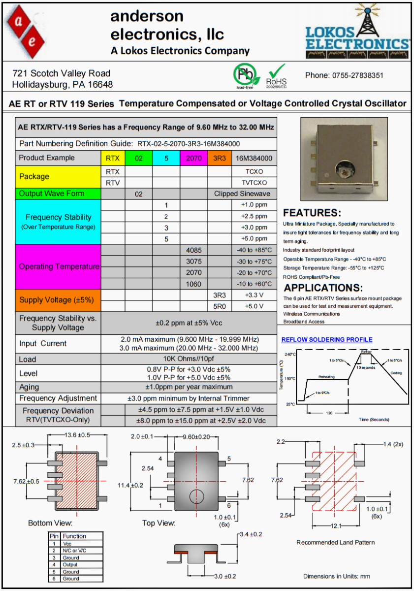 AE RT或RTV 119系列溫度補(bǔ)償振蕩器或壓控振蕩器。AE RTX/RTV-119系列的頻率范圍為9.60 MHz至32.00 MHz