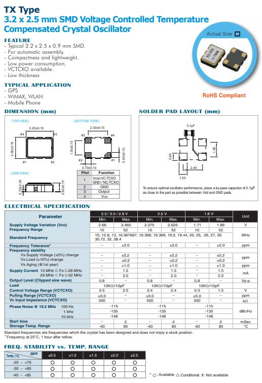 更多>>高性能的泰藝溫補晶體振蕩器TXETDCSANF-20.000000最適合全球定位系統
