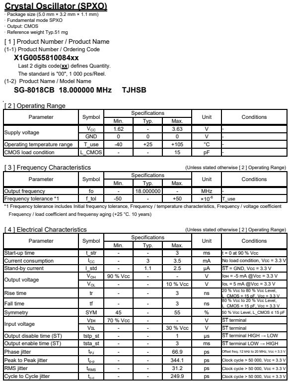 | X1G005581008400 | SG-8018CB | 18.000000 MHz | 5.00 x 3.20 x 1.30 mm | CMOS | 1.620 to 3.630 V | -40 to 105 °C | +/-50 ppm |