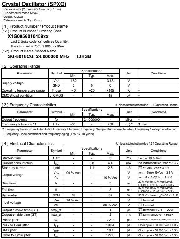 | X1G005601050100 | SG-8018CG | 24.545454 MHz | 2.50 x 2.00 x 0.80 mm | CMOS | 1.620 to 3.630 V | -40 to 105 °C | +/-50 ppm |