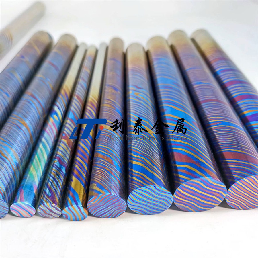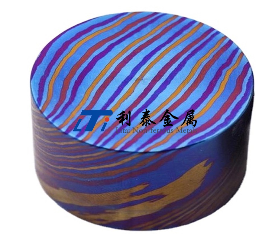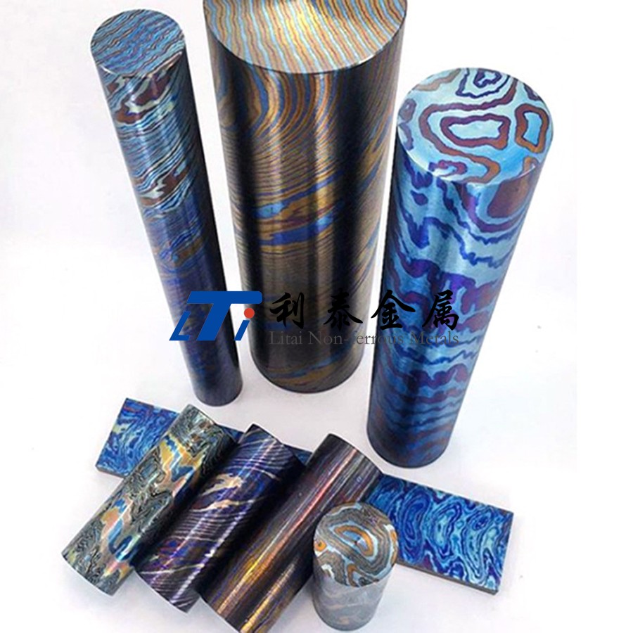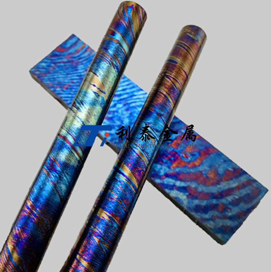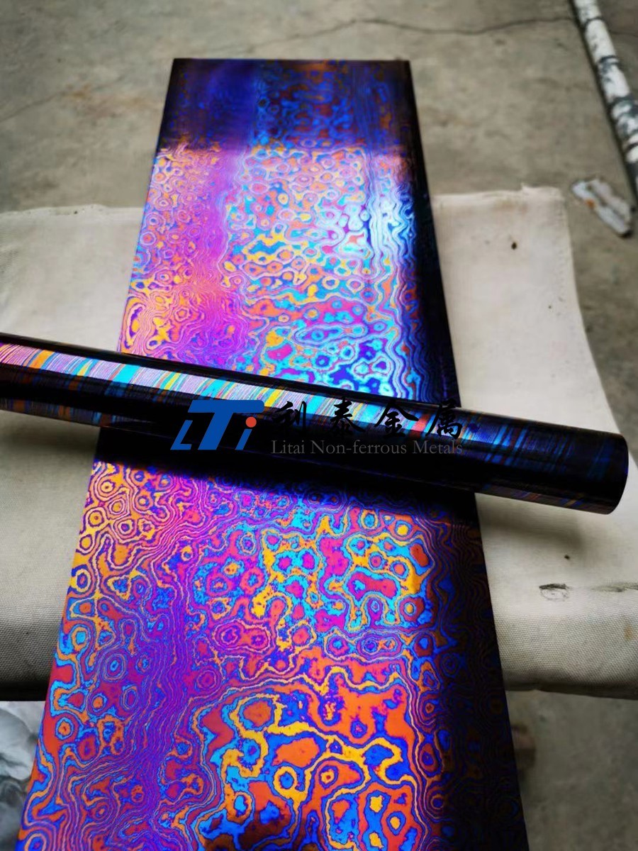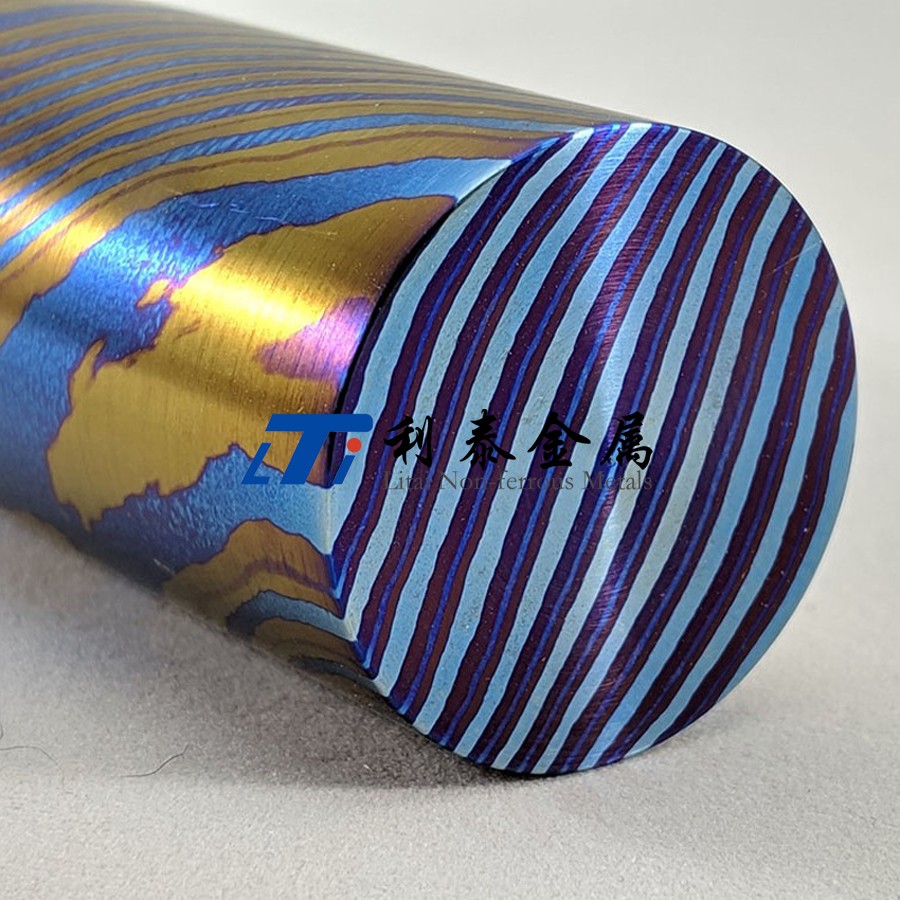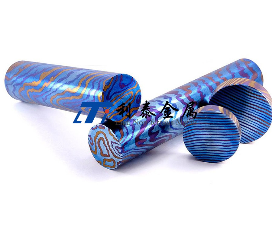 鈦馬士革是由兩種或兩種以上的鈦合金疊鍛而成。然后通過熱處理(鈦燒藍)或者陽極氧化,形成不同的顏色分層的鈦合金材質(zhì)。