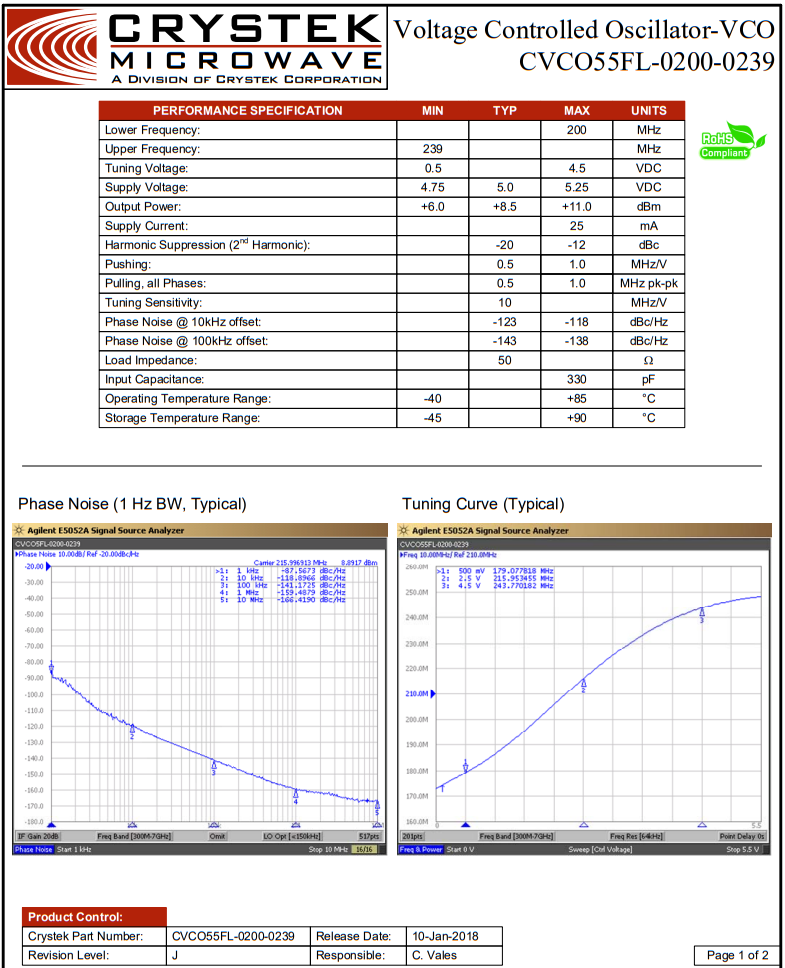 CVCO55FL-0200-0239在美國設(shè)計和制造,采用行業(yè)標準的0.5 x 0.5英寸SMD封裝。輸入電壓為5v,最大電流消耗為25ma。拉力和推力分別最小化到1.0 MHz pk-pk和1.0 MHz/V。二次諧波抑制典型值為-20 dBc。