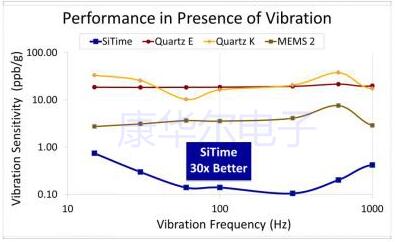 振動靈敏度或g靈敏度(以ppb/g表示)表示由加速力引起的頻率變化.圖1繪制了以ppb/g為單位的正弦振動引起的噪聲雜散,以證明與基于石英的振蕩器相比,SiTimeMEMS振蕩器在不同頻率下的振動靈敏度較低. 此外,SiTime振蕩器在1.5x0.8mm的小型封裝(kHz振蕩器)和2.0x1.6QFN和SOT23-5小型封裝(MHz振蕩器)中提供0.1ppb/g的性能.石英設備必須使用大型專用包裝才能實現較低的g敏感度.