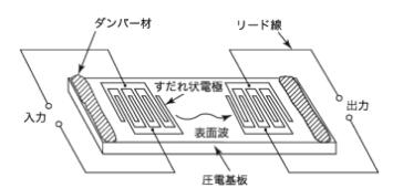 圖一顯示了SAW濾波器的基本結構。SAW濾波器具有這樣的結構,其中用于激勵和接收表面波的叉指電極設置在壓電基板上,當交流電壓施加到叉指式換能器時,壓電效應引起相鄰電極之間的壓電基板的變形交激發表面波。圖二表面叉指式換能器周期性地排列,當波長λ和電極周期相等時,表面波被最強烈地激發在中心頻率f0和表面波傳播速度v之間存在f0=v/λ的關系。兩種類型的SAW,一種使用延遲電極結構,另一種使用諧振電極結構。