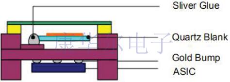 圖6說(shuō)明了具有H型封裝結(jié)構(gòu)的TCXO.封裝的橫截面類(lèi)似于字母H,在上腔中安裝有密封AT切割石英諧振器,在下腔中安裝有IC芯片.不合格的石英晶體諧振器可以在倒裝芯片組裝之前進(jìn)行檢查和剔除.
