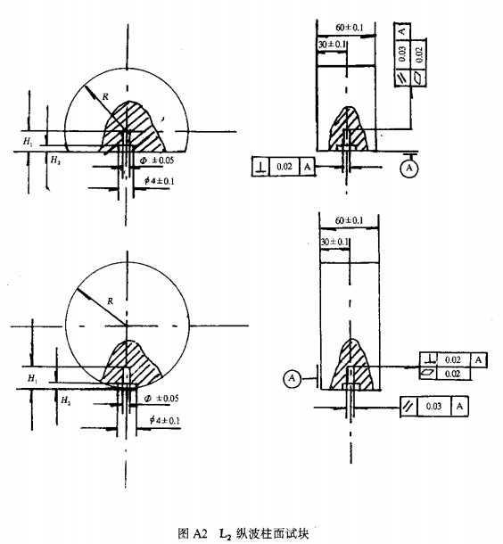 6.2.2.1 縱波探傷校準標準靈敏度使用的L1、L2試塊見圖A1、圖A2。